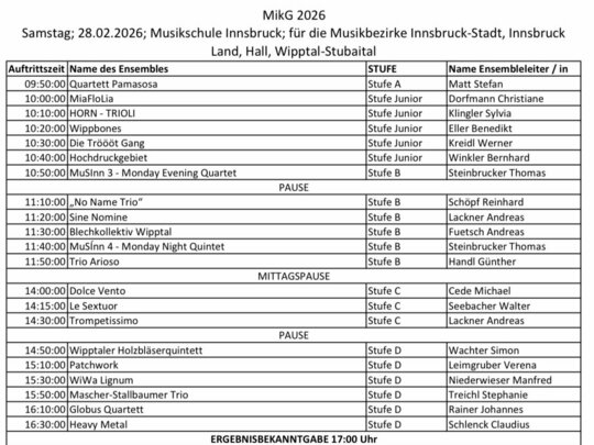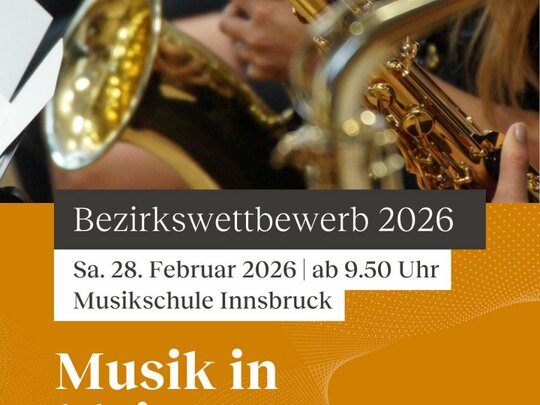 Am Samstag, 28. Februar 2026 findet ab 9:50 Uhr in der Musikschule Innsbruck der Bezirkswettbewerb „Musik in kleinen Gruppen“ statt.