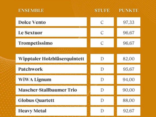 Am Samstag, 28. Februar 2026 fand in der Musikschule Innsbruck der Bezirkswettbewerb „Musik in kleinen Gruppen“ statt. Dabei konnten drei Ensembles unseres Bezirkes hervorragende Ergebnisse erzielen.